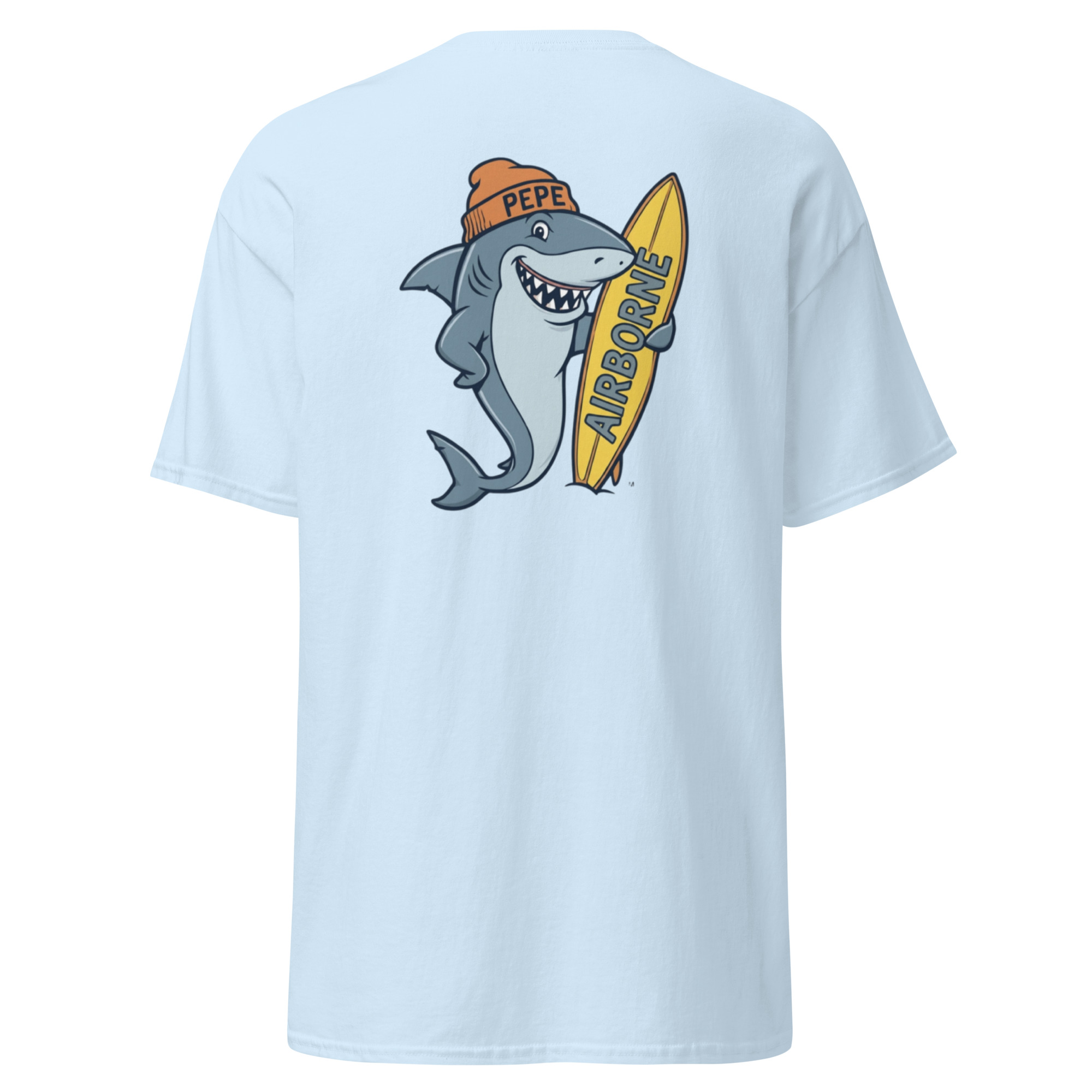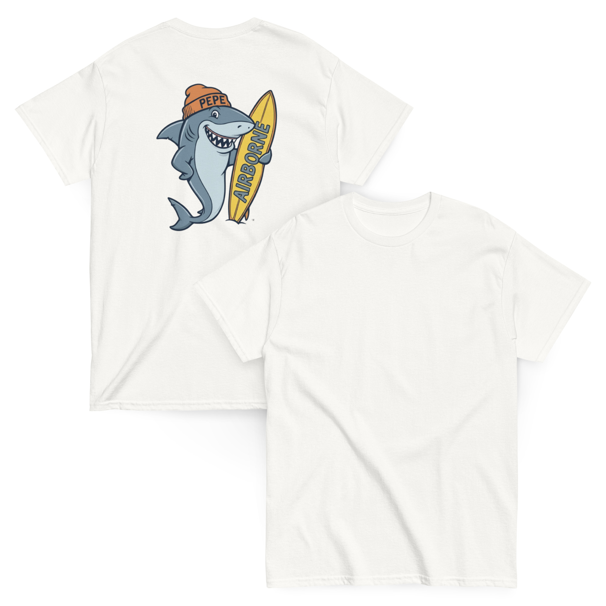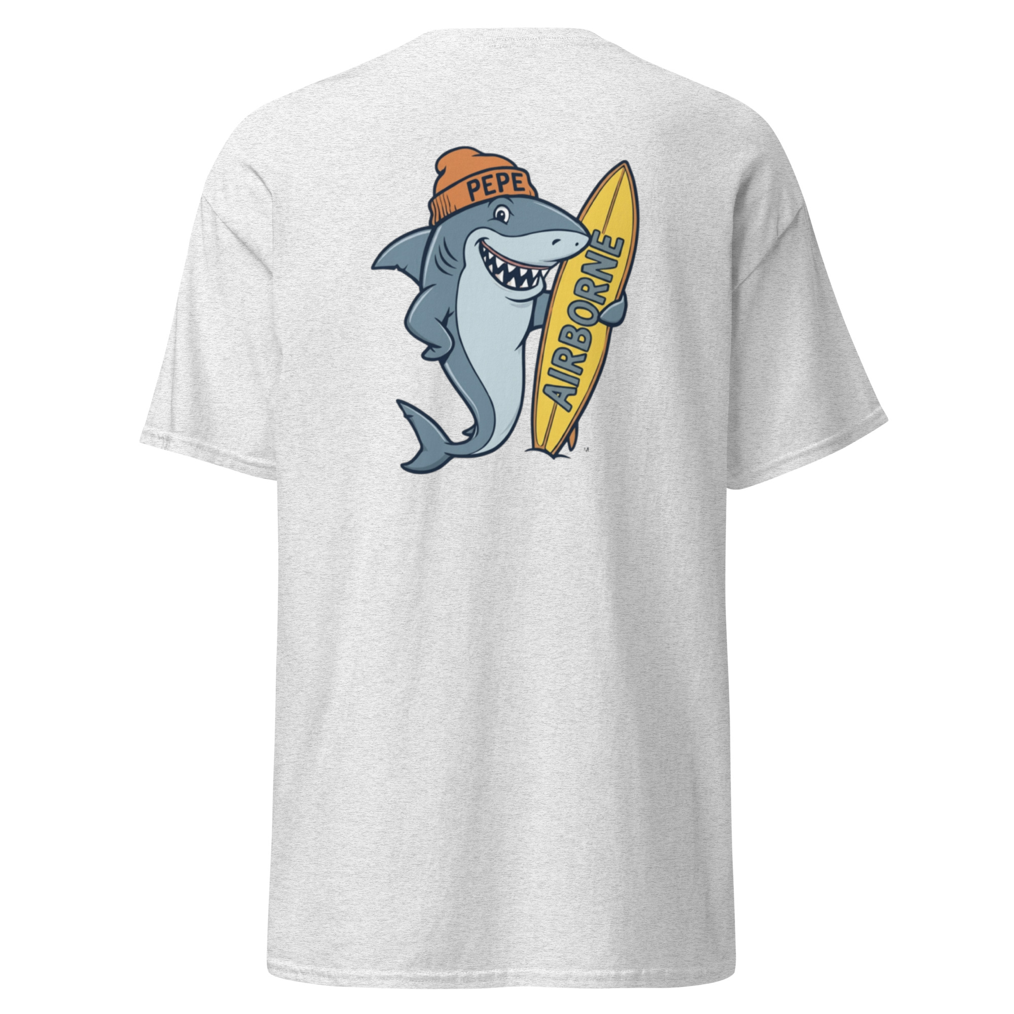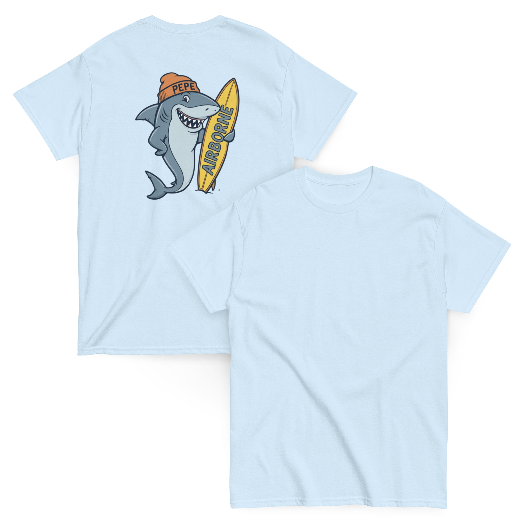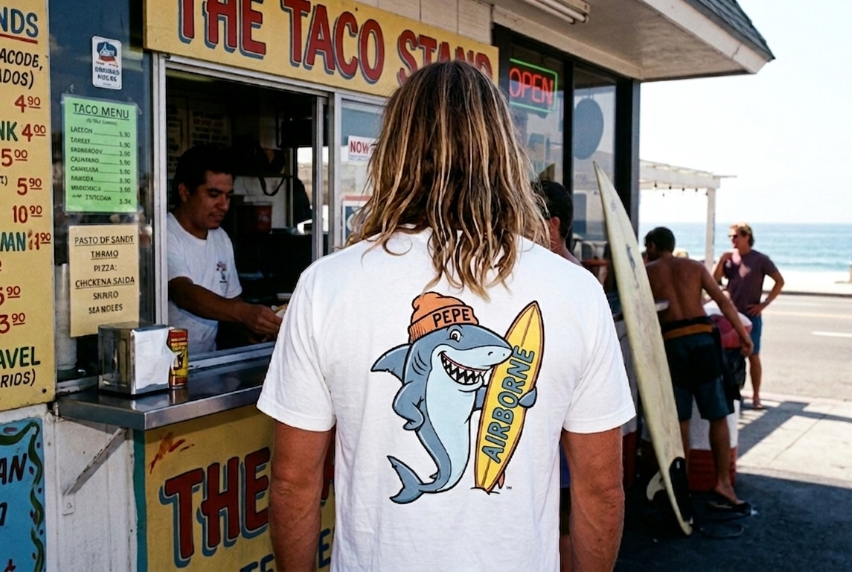 Printed with original-inspired artwork featuring Pepe and the Airborne surfboard graphic, this shirt feels like a lost piece of 90s movie merch in the best way. It is fun, nostalgic, and made for people who know that the best references are the ones not everybody catches right away.